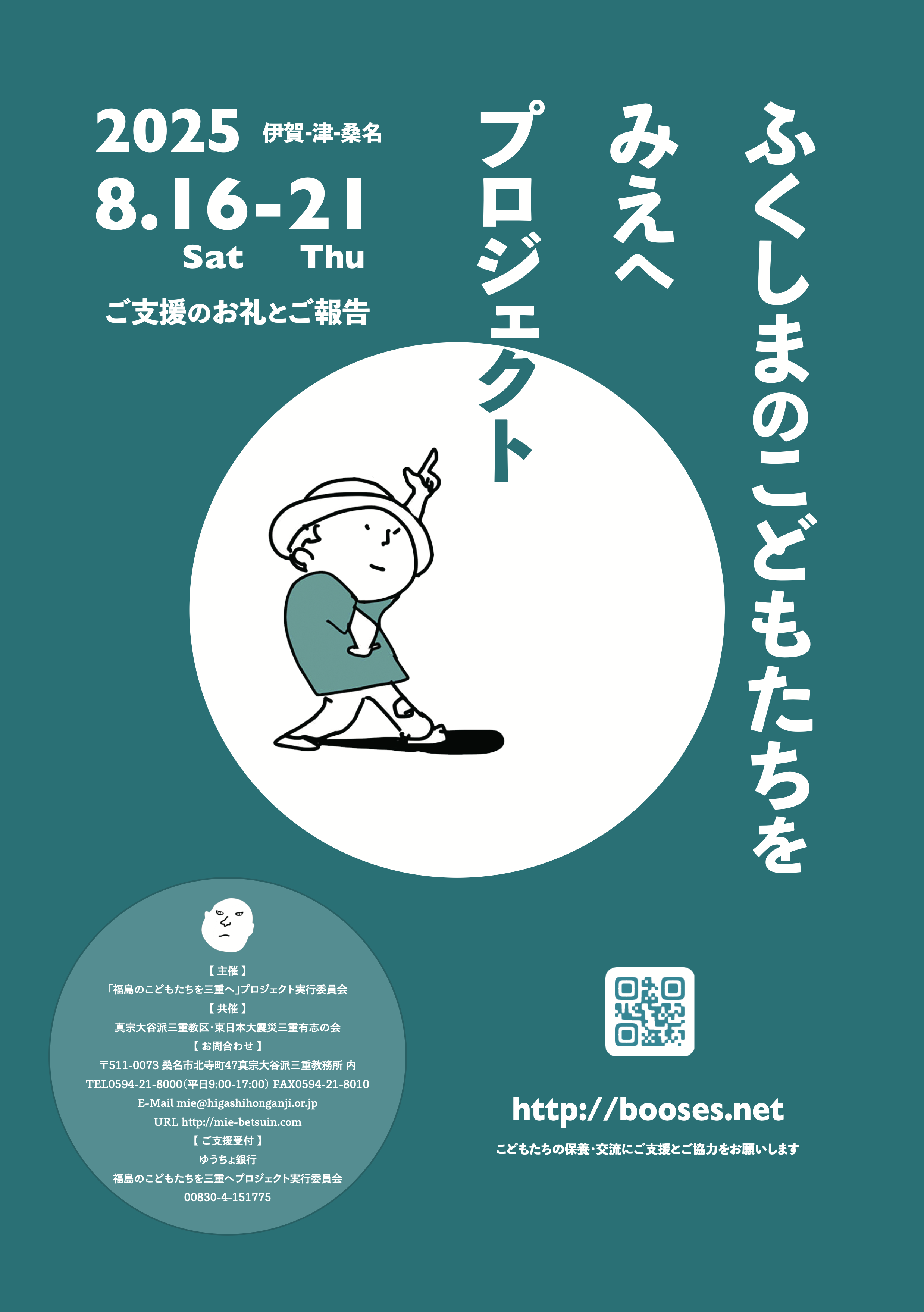 スタッフ学習会 7月24日(水)14時- テーマ:「福島の現状と保養の必要性について」 お 話: 八幡朋行さん[福島県相馬市] プロジェクトスタッフ対象ですが、公開学習会ですのでどなたでもご参加いただけます。 場所:桑名別院本統寺聞光殿 住所:桑名市北寺町47番地 問い合わせ:三重教務所 ☎︎0594-21-8000 |