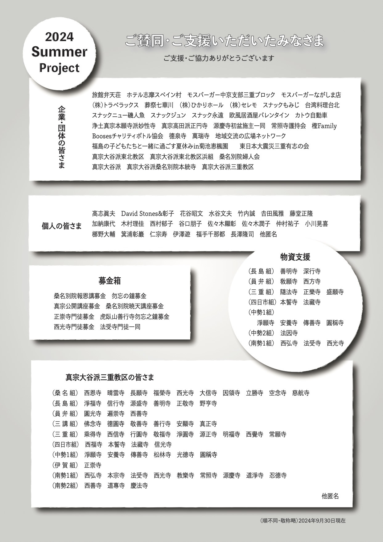 鳥羽水族館、マルカ運輸株式会社、株式会社セレモ、鳥羽志摩農業協同組合、カトウ自動車、有限会社山口商事、岡林仏壇店、あづま食品株式会社、盛德海運建設株式会社、株式会社プライム七華川、伊勢葬祭、葬儀会館ひかりホール、お菓子職人おとべ、平成介護、イベント企画・葬儀司会 シルエット、有限会社 鈴木石材、株式会社アイブレーン、三重県アートジュエリー協会、国府消防団、国府スポーツ少年団、喫茶 オリゾン、喫茶じゅん、スナック秋桜、ときわ湯、スナック永遠、Ryu-01、Takeshi Nakatani、株式会社 石庵、Lamp、㈲ももや酒店、株式会社 中央印刷、二光堂、ヒラマツ布団店、株式会社ほくせい、瀬木企画デザイン設計事務所、カトーレンタカー、すし工房なばな、福井屋、五大、フセイ、カフェモナリザ、桑名市、桑名市教育委員会、桑名市社会福祉協議会、伊賀市社会福祉協議会、交易社団法人伊勢志摩観光コンベンション機構、鳥羽市錦町 町内会、錦町中老会、志摩市民の会、桑名の千羽鶴を広める会、はまぐりプラザ、レディオキューブFM三重、Suzuka Voice FM、三重大学、高田高校(高田学苑)、同朋大学、真宗本願寺派妙性寺、真宗高田派浄徳寺、震災支援ネットワーク東海(本願寺派)、仙台教区仏教青年会、NPO法人TEAM二本松、グループちいちの花、いなべ親鸞塾、源慶寺門徒募金、常照寺護持会、浄願寺募金箱、法受寺門徒募金、浄円寺門徒募金、西恩寺門徒一同、唯福寺門徒一同、源慶寺初盆施主一同、長願寺門徒一同、晴雲寺門徒有志、安養寺募金箱、法蔵寺門徒有志、真宗公開講座(中南勢伊賀組)募金、員弁組、三重組同朋大会募金、四日市組同朋大会募金、桑名組同朋大会募金、「仏教に学ぶ講座」修了者・スタッフ一同(南勢一組)、檉ファミリー、三重教務所募金箱、桑名別院募金箱、桑名別院婦人会一同、三重教区有志の会、真宗大谷派(本山)、真宗大谷派三重教区、真宗大谷派三重教務所、桑名別院、真宗大谷派岡崎教務所 匿名5団体