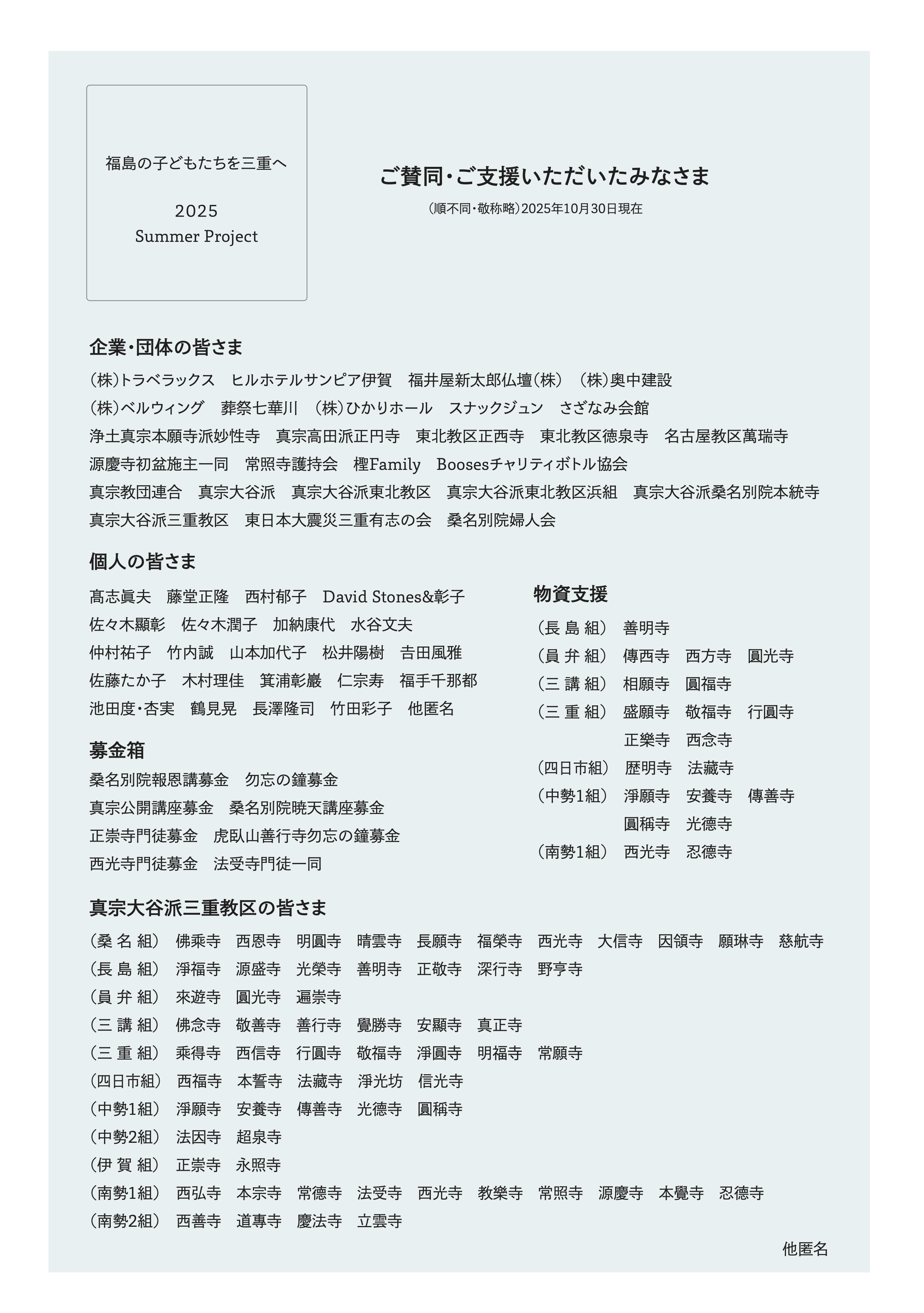 全日本仏教会、真宗高田派宗務院、真宗高田派青年会、高田学苑 (高田高等学校、高田短期大学)、真宗高田派正圓寺、真宗高田派正太寺、真宗高田派浄徳寺、日蓮宗妙典寺、高野山真言宗寶藏寺、真言宗醍醐派地蔵院、浄土真宗本願寺派妙性寺、三重大学、同朋大学、三重教区お待ち受け大会、三重教区伊賀組、中南勢組公開講座募金、法受寺門徒一同、西恩寺同行一同、永照寺門徒募金箱、正崇寺門徒募金箱、淨願寺門徒募金箱、安養寺門徒有志一同、専明寺門徒有志、晴雲寺門徒有志一同、いなべ親鸞塾、NPO法人TEAM二本松、三重教区坊守会、三重教区有志の会、